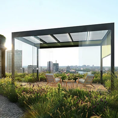 - Integration von Schiebeelementen aus Glas, Holz oder Aluminium als seitlicher Sicht- und Wetterschutz